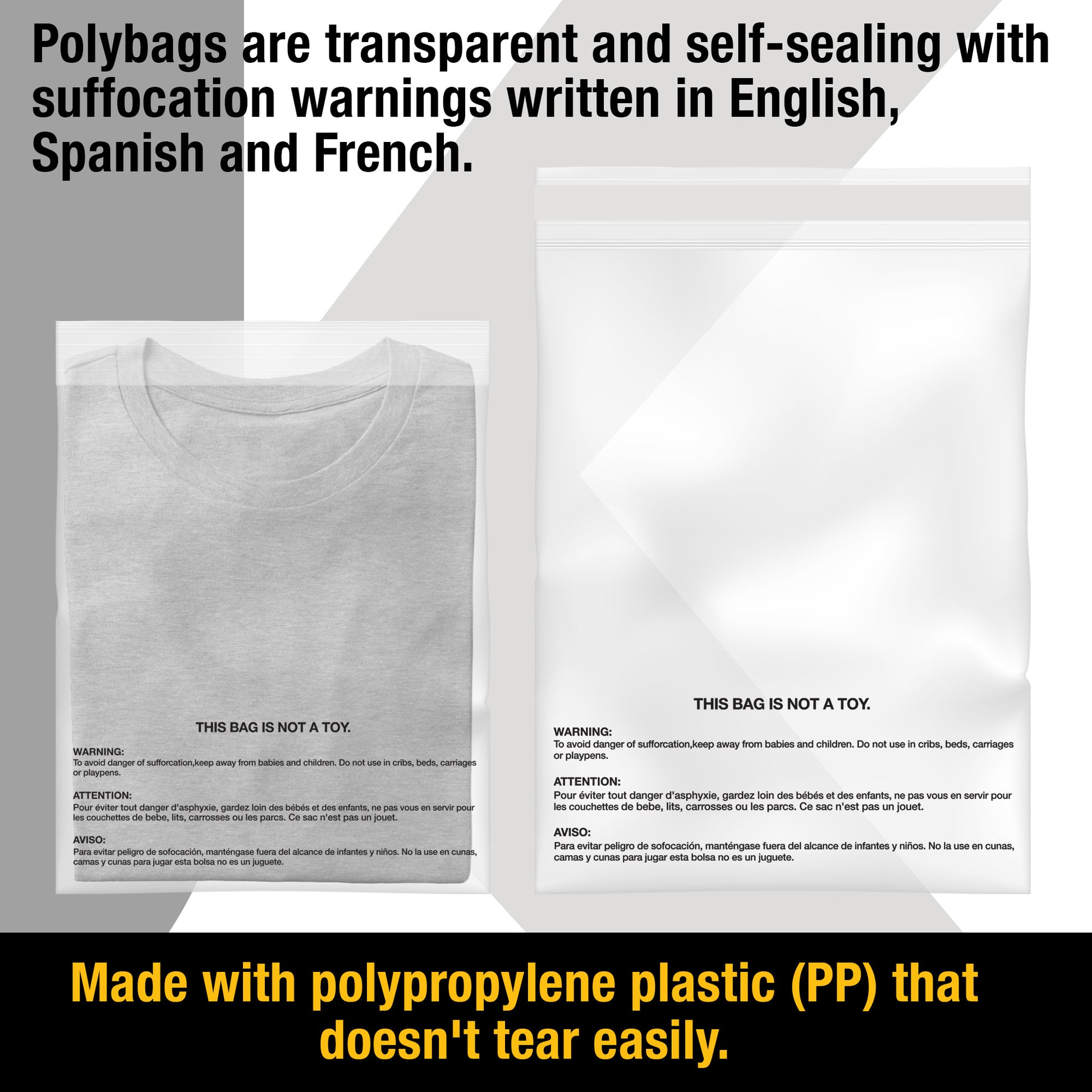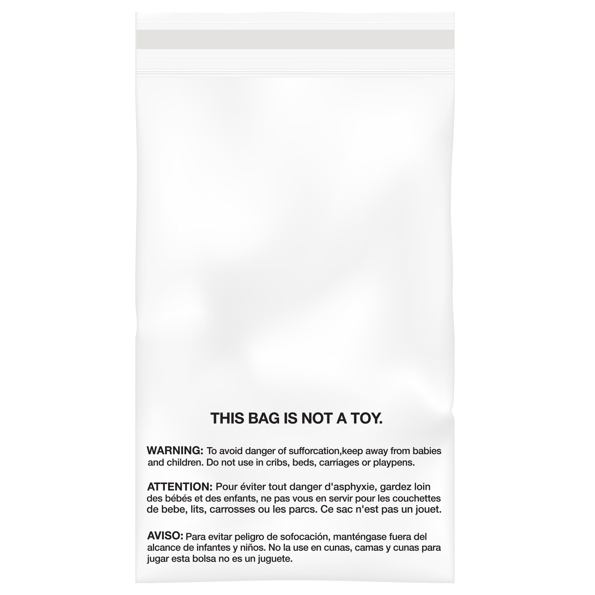 Plastic Bag with Suffocation Warning: "TO AVOID DANGER OF SUFFOCATION, KEEP AWAY FROM BABIES AND CHILDREN. DO NOT USE IN CRIBS, BEDS, CARRIAGES OR PLAYPENS, THIS BAG IS NOT A TOY." Printed on the side in English, Spanish, and French.